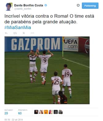 "Incredibile vittoria contro la Roma. Tutti i miei compagni meritano i complimenti per la grande prestazione", il tweet di Dante, lasciato in panchina -