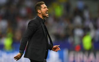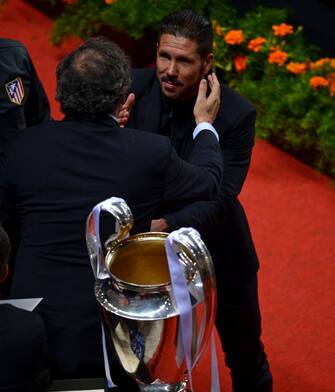 Simeone riceve il saluto di Platini poco dopo aver sfiorato il titolo. Il gol di Ramos nei minuti di recupero ha portato il match ai supplementari poi vinti dal Real -