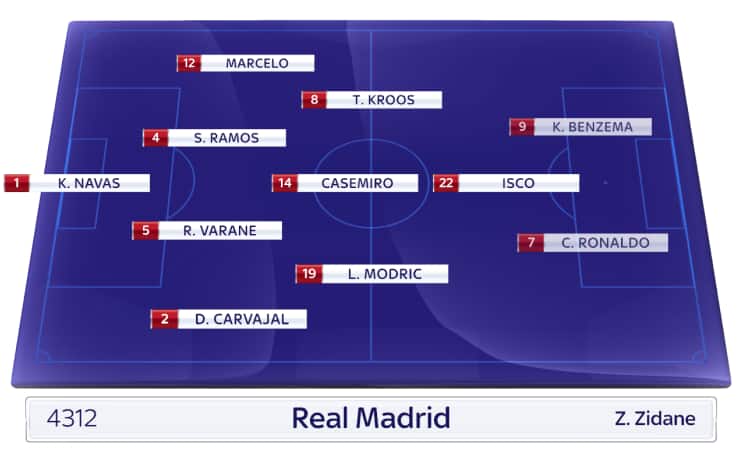 Real Madrid (4-3-1-2): Navas; Carvajal, Varane, Ramos, Marcelo; Modric, Casemiro, Kroos; Isco; Benzema, Ronaldo. All. Zidane