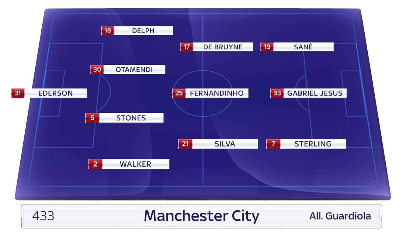 Manchester City (4-3-3): Ederson; Walker, Stones, Otamendi, Delph; De Bruyne, Fernandinho, Silva, Sterling, Gabriel Jesus, Sané. All: Guardiola