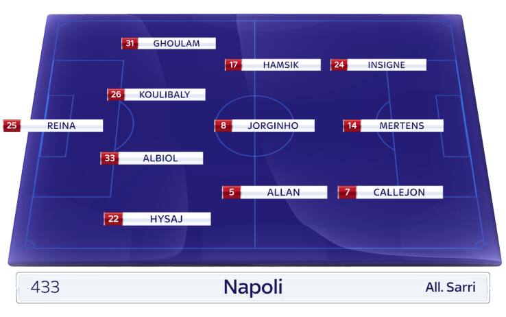Napoli (4-3-3): Reina; Hysaj, Albiol, Koulibaly, Ghoulam; Allan, Jorginho, Hamsik; Callejon, Mertens, Insigne. All. Sarri
