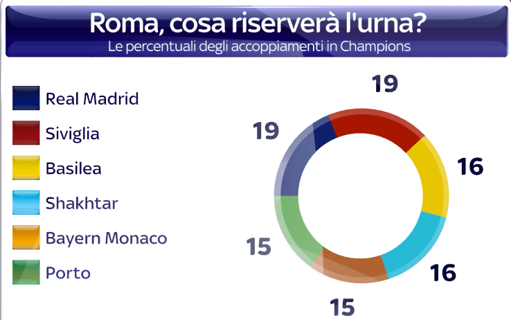La Roma, superando 1-0 il Qarabag, ha vinto il proprio gruppo di Champions e al sorteggio sarà testa di serie. I giallorossi potranno incontrare solo le seconde classificate nella fase a gironi, senza possibilità di incrociare altre squadre italiane o formazioni già affrontate nella competizione. Juventus e Chelsea sono quindi da escludere, restano sei nomi: Real Madrid, Bayern Monaco, Basilea, Shakhtar, Siviglia e Porto. Secondo le probabilità statistiche, queste sei formazioni hanno però possibilità diverse di trovare la Roma. Le avversarie più probabili sono le spagnole, Real Madrid e Siviglia, con un 19% a testa. Seguono Basilea e Shakhtar con il 16%, Bayern Monaco e Porto le meno plausibili (15% di incontrare i giallorossi).