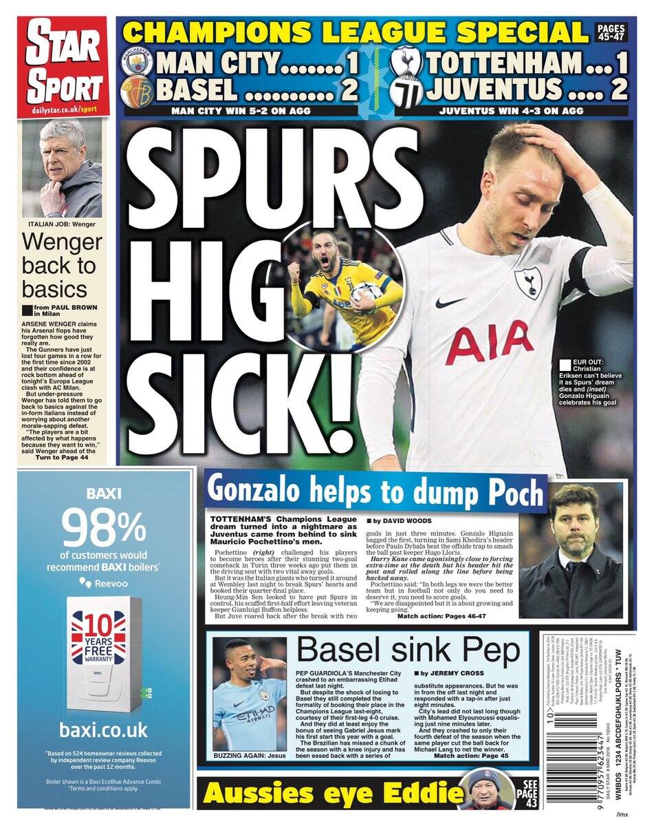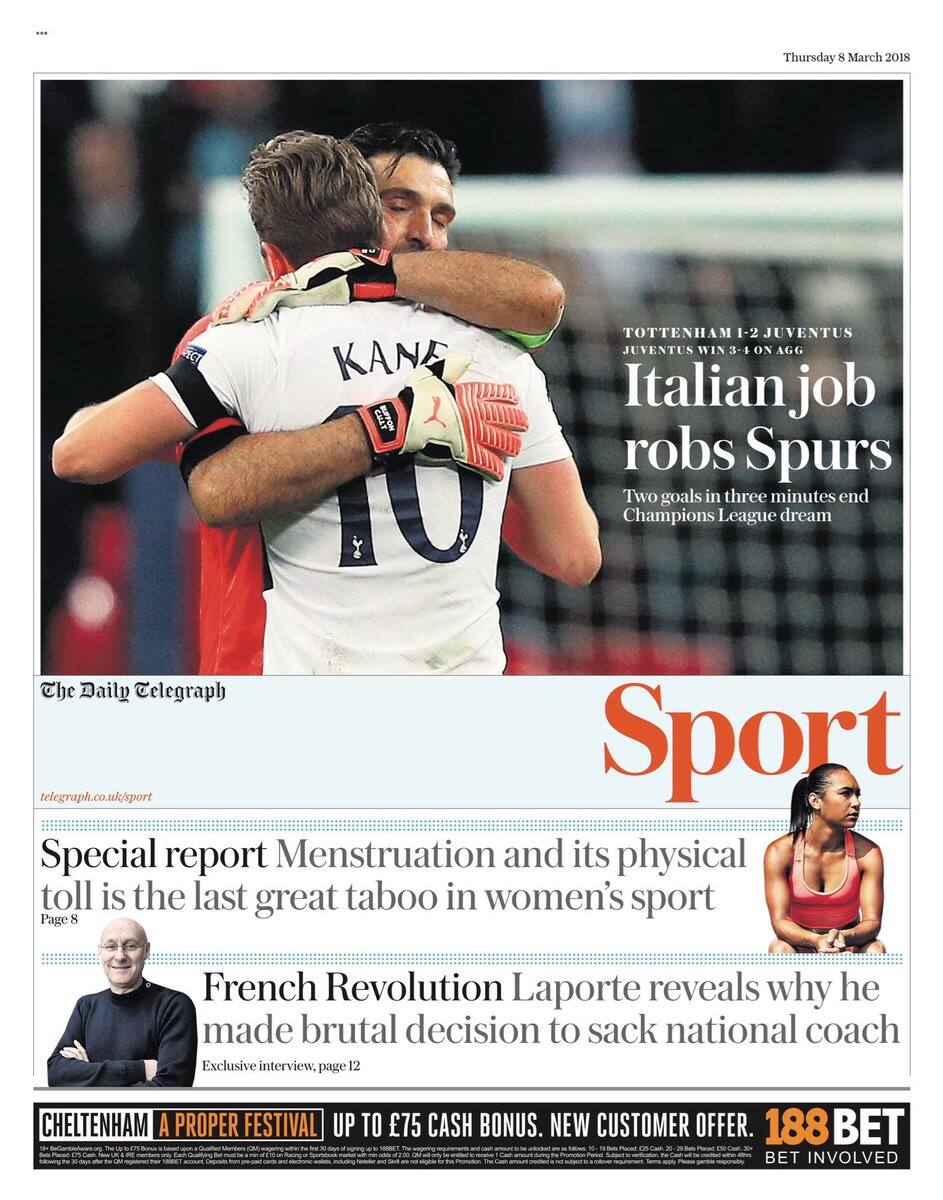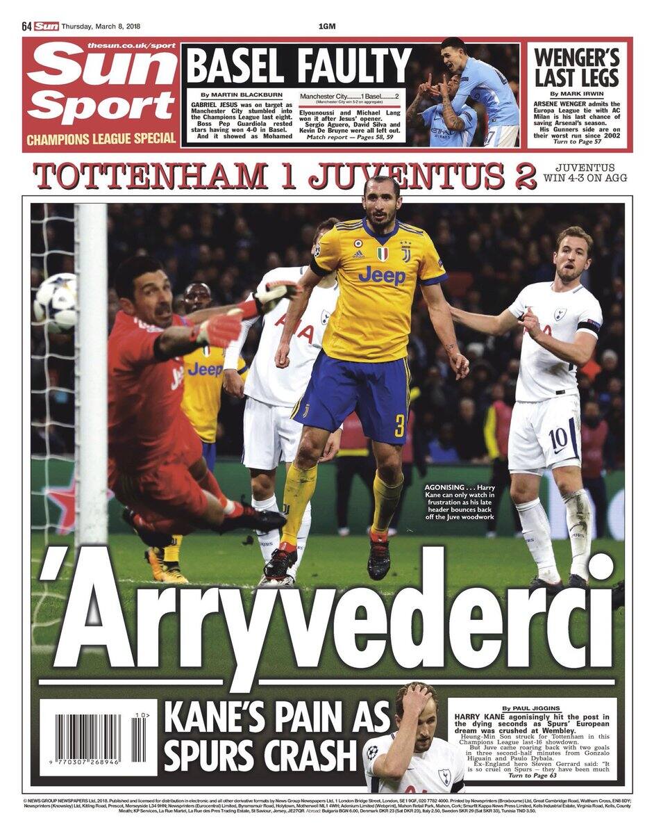 La vittoria della Juventus sul Tottenham nell'ottavo di ritorno di Champions League (2-2 l'andata) trova ampio spazio anche nei giornali inglesi. "Arryvederci" si legge sul Sun, mentre. "Seconds out", titola invece il Mirror che sottolinea la delusione degli Spurs dopo la rimonta della Juventus arrivata nei minuti finali. "Italian jobs robs Spurs", titola il Daily Telegraph che in prima pagina pubblica l'abbraccio a fine gara tra Kane e Buffon.