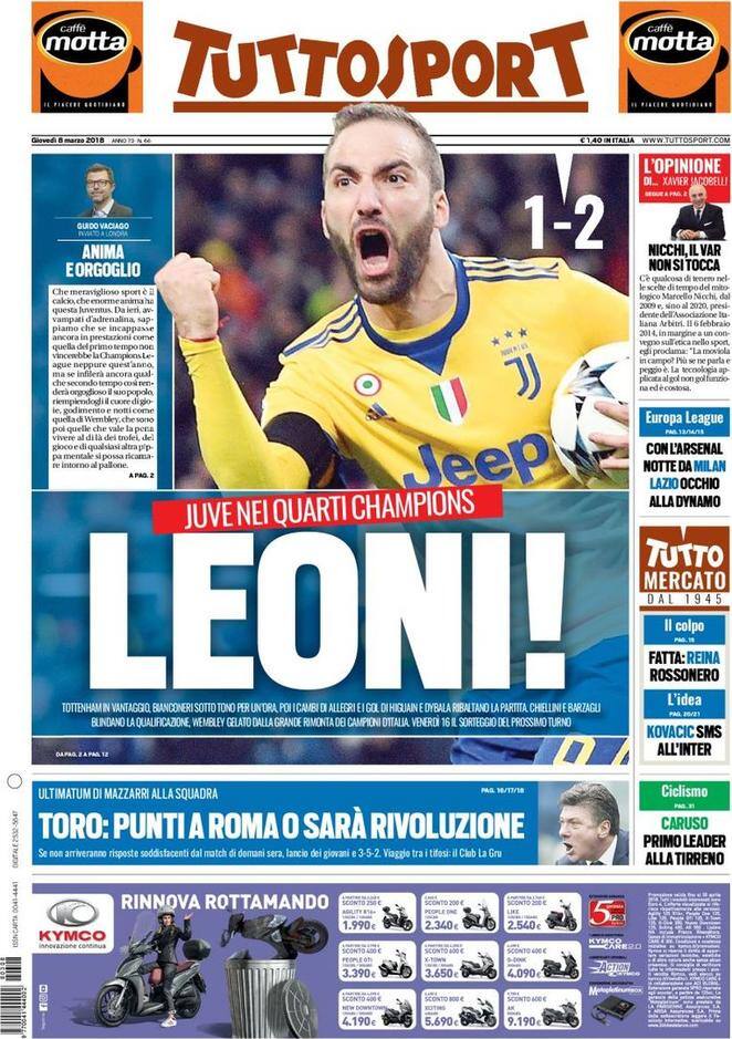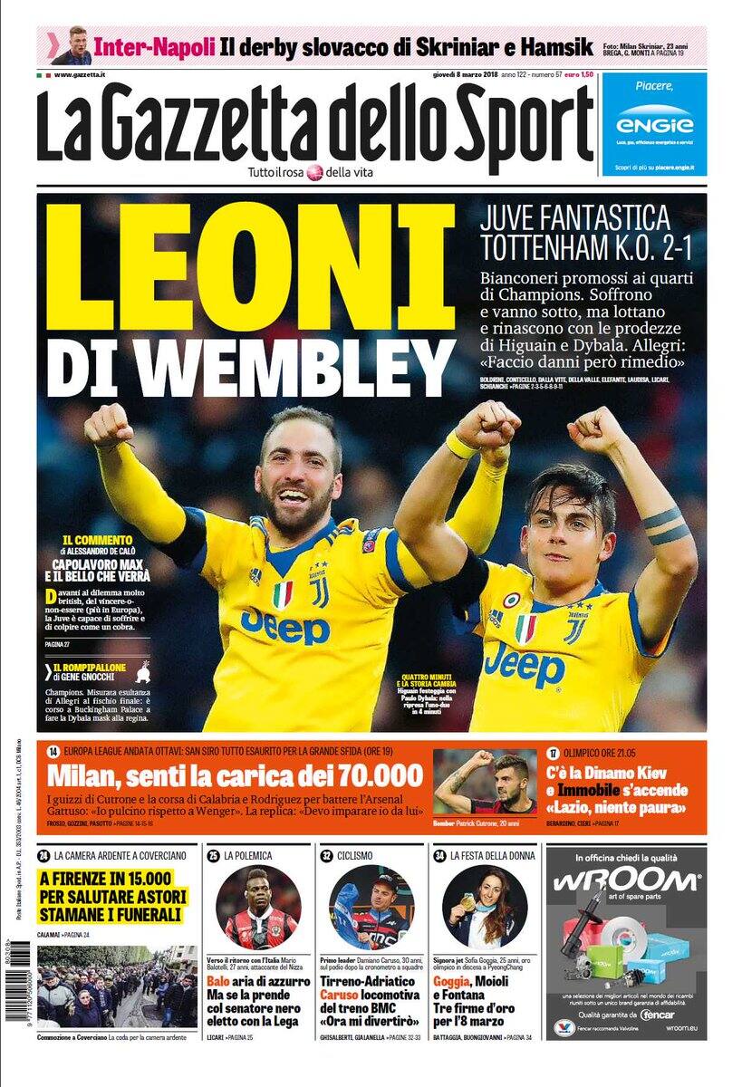 I volti sorridenti di Higuain e Dybala, la gioia bianconera in terra inglese: nelle prime pagine dei quotidiani sportivi trova ampio spazio la vittoria in rimonta della Juventus sul Tottenham che ha permesso alla formazione di Max Allegri di accedere ai quarti di finale di Champions League. "Leoni di Wembley", titola la Gazzetta dello Sport che poi commenta: "Juve fantastica, Tottenham ko 2-1. Bianconeri promossi ai quarti di Champions. Soffrono e vanno sotto, ma lottano e rinascono con le prodezze di Higuain e Dybala. Allegri: 'Faccio danni però rimedio'". L'esultanza di Higuain e Dybala nella prima pagina del Corriere dello Sport che titola: "Leoni di Wembley. Champions: Juve strepitosa, Higuain e Dybala ribaltano (1-2) il Tottenham e irrompono nei quarti". Tuttosport in prima pagina: "Leoni", il quotidiano torinese poi aggiunge: "Juve nei quarti di Champions. Tottenham in vantaggio, bianconeri sotto per un'ora, poi i cambi di Allegri e i gol di Higuain e Dybala ribaltano la partita. Chiellini e Barzagli blindano la qualificazione, Wembley gelato dalla grande rimonta dei campioni d’Italia. Venerdì 16 il sorteggio del prossimo turno".