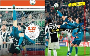 La domanda divide i popoli. Gli spagnoli, i soliti esagerati, calcolano un'altezza di 2 metri e 38 e il quotidiano Marca spara la cifra nella grafica di una sua paginata. In Italia, la Gazzetta dello Sport precisa in un focus che l'impatto con il pallone è avvenuto a un'altezza di 2,27 metri. Undici centimetri di differenza che certamente non ci faranno cambiare opinione sul fenomeno portoghese, del quale tra l'altro conoscevamo già la forza esplosiva nei balzi e nello stacco. Nel 2013, contro il Manchester United (sempre in un match di Champions) CR7 aveva lasciato tutti a bocca aperta colpendo il pallone a un'altezza di 2 metri e 93 centimetri. Secondo i calcoli di As, quindi, in quell'occasione Ronaldo aveva staccato i piedi da terra di oltre un metro, essendo alto 1,87 m. Ma quello fu un gol di testa, uno stacco imperioso che non diede alcuna chance a Evra che lo marcava né a De Gea che si trovava in porta. Qui il discorso è diverso: Cristiano si è inventato una rovesciata volante portando i propri glutei all'altezza degli occhi di De Sciglio, allungando la sua gambona muscolosa e ricadendo con l'agilità di un gatto.