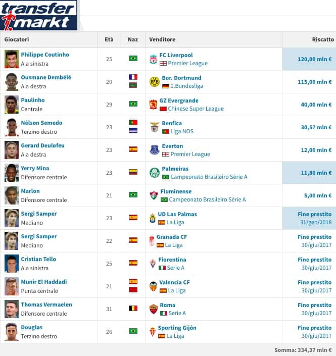 In grafica le due finestre di mercato più dispendiose del Barcellona delle ultime dieci stagioni. Quella, soddisfacente, che porterà al triplete del 2015 (sopra). E l’ultima (sotto), con la bellezza di oltre 330 milioni investiti (fonte Transfermarkt)