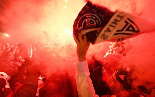 Il pullman del Psg, all'arrivo allo stadio, è stato accolto così, tra fumogeni e cori, udibili anche dall'interno del Parco dei Principi una volta iniziata la partita