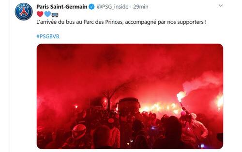 Centinaia di tifosi del PSG si sono radunati davanti al Parco dei Principi prima di PSG-Borussia Dortmund nonostante la disposizione di disputare la partita a porte chiuse a causa dell'emergenza coronavirus: hanno accolto la squadra di casa tra cori e fumogeni. "Festa" proseguita anche nel corso della partita, che ha visto la qualificazione ai quarti dei parigini