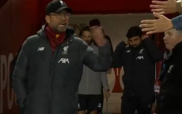 Dura reazione dell'allenatore dei Reds all'ingresso in campo ad Anfield: in piena emergenza Coronavirus, alcuni tifosi del Liverpool allungano la mano in cerca di un "cinque", lui li rimprovera. Poi il saluto con Simeone usando il gomito