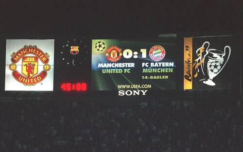 MANCHESTER UNITED-BAYERN MONACO 2-1, FINALE 1999 - Non fatevi ingannare dal minuto numero 45 sul maxi schermo del Camp Nou, in realtà (come conferma l'orario, le 10.31) si trattava del 45' del secondo tempo. Di una finalissima. Manchester 0, Bayern 1. Ma vinceranno i diavoli rossi di Sir Alex Ferguson.