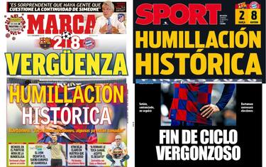 Il giorno dopo l'8-2 subito dal Bayern Monaco, sono durissime le reazioni dei quotidiani sportivi spagnoli contro il Barcellona. Dal "Vergogna" di Marca al "Fine ciclo vergognoso" del Mundo Deportivo, fino al "Umiliazione storica" che accomuna Sport e As. Reazioni ovviamente diverse in Germania con la homepage della Bild che parla di "Vittoria del secolo". Vediamo le prime pagine