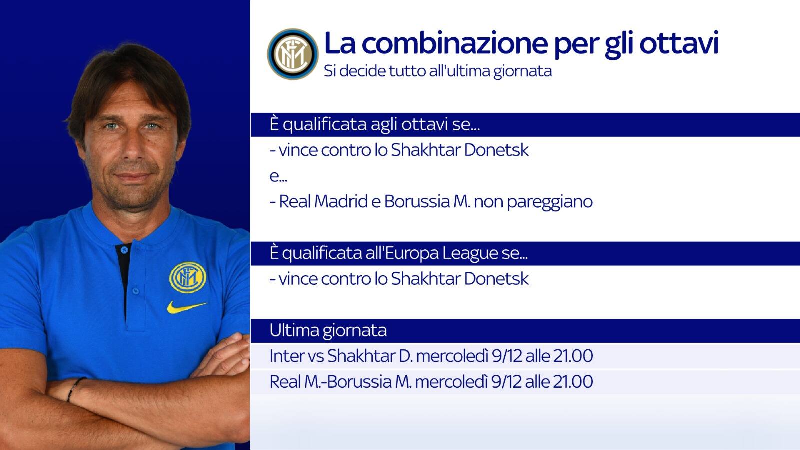 Concretamente parlando e prima di andare a vedere nel dettaglio tutti gli incastri, sono due le opzioni per l'Inter per la qualificazione. E entrambe partono necessariamente dai tre punti della squadra di Conte contro gli ucraini a San Siro, mercoledì 9 dicembre prossimo. In quel caso l’unico risultato che impedirebbe ai nerazzurri l’aritmetica possibilità di avanzare agli ottavi di finale, è il pareggio tra Real Madrid e Borussia Moenchengladbach: