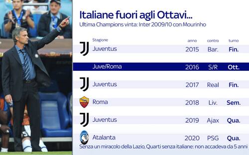 ITALIANE FUORI AGLI OTTAVI DOPO CINQUE ANNI? L'ultima Champions vinta da una squadra di Serie A resta il trionfo dell'Inter di Mourinho nel 2010. La stagione prima di quel 2015/16 (con Roma e Juve out agli ottavi), i bianconeri erano riusciti un'altra volta ad arrivare in finale, perdendo contro il Barcellona. A partire da quella dopo, invece, almeno un'italiana ha sempre superato il primo step della fase a eliminazione diretta. Avremo in quest'edizione, dopo cinque anni, dei quarti di finale senza italiane? L'ultima speranza per evitarlo si chiama Lazio