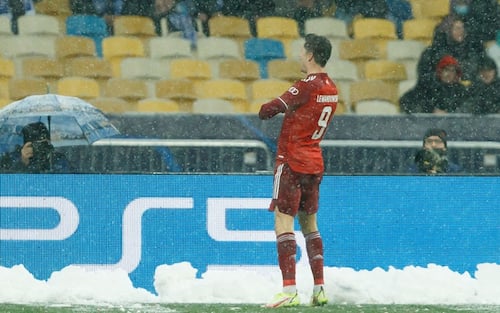 Champions, Lewandowski: gol in rovesciata sotto la neve e con lo scarpino slacciato! FOTO