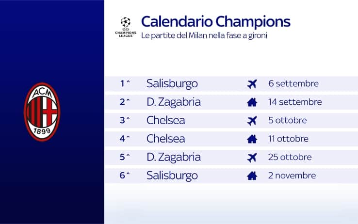 Girone sulla carta abbordabile per il Milan, testa di serie in quanto campione d'Italia. I rossoneri sono stati inseriti nel girone E insieme a Chelsea, Salisburgo e Dinamo Zagabria: esordio in Austria il 6 settembre, a inizio ottobre il doppio confronto con i Blues prima della chiusura a San Siro contro il Salisburgo. Ecco tutte le date e gli orari delle gare della squadra di Pioli