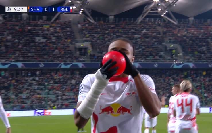 ma che fa?Esultanza strana, molto strana del giocatore del Lipsia dopo il primo gol dei tedeschi in casa dello Shakhtar Donetsk: prima riceve l'abbraccio dei compagni di squadra, poi gonfia un palloncino...