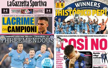 Il giorno dopo la finale di Champions, i quotidiani italiani sottolineano la grande prestazione dell'Inter, evidenziando rimpianti e rammarichi. In Inghilterra si celebra il "Treble" del City, la Spagna esalta l'impresa di Guardiola e il match-winner Rodri