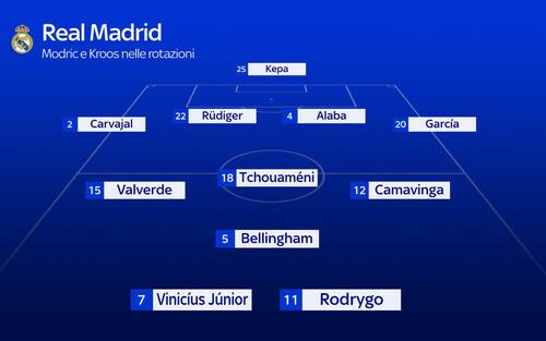 - (4-3-3): Kepa; Carvajal, Rudiger, Alaba, Garcia; Valverde, Tchouameni, Camavinga; Bellingham; Vinicius Junior, Rodrygo. All. Ancelotti