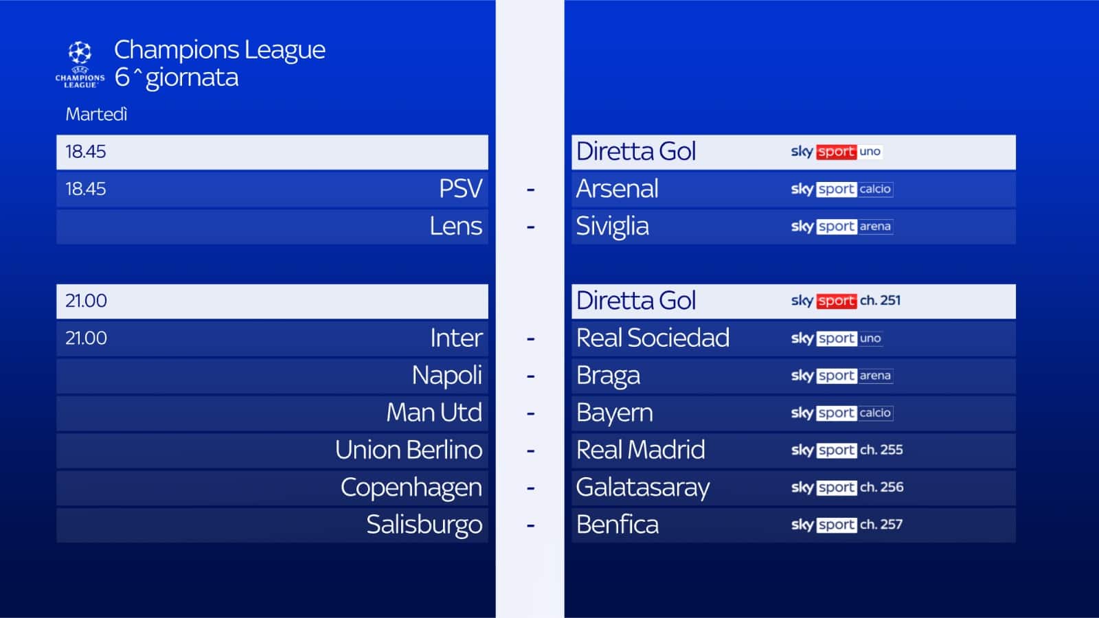 guida tvLa Champions League con la sesta e ultima giornata della fase a gironi, è live su Sky e in streaming su NOW. 15 partite LIVE da seguire anche in contemporanea con Diretta Gol. Studi pre e postpartita affidati a Federica Masolin Insieme al top team di ospiti tra cui, martedì, Esteban Cambiasso e Fabio Quagliarella