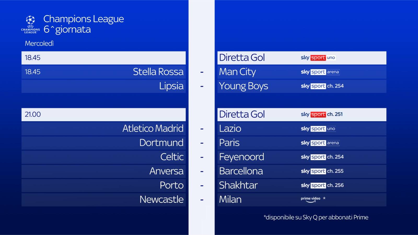 Champions League e squadre in campo per la sesta e ultima giornata della fase a gironi della massima competizione europea, live su Sky Sport e in streaming su NOW, con la possibilità di seguire 15 partite per ogni turno, anche in contemporanea grazie a Diretta Gol. Mercoledì, alle 21, in campo la Lazio che vola a Madrid per sfidare l’Atletico di Simeone (Sky Sport Uno, Sky Sport 252 e in streaming su NOW). Mercoledì alle 21 anche Newcastle-Milan: il match sarà visibile senza uscire da Sky Q, in modo semplice e diretto, attraverso l'App Prime Video di Amazon, per i clienti Sky con decoder Sky Q e abbonati al servizio Amazon Prime.