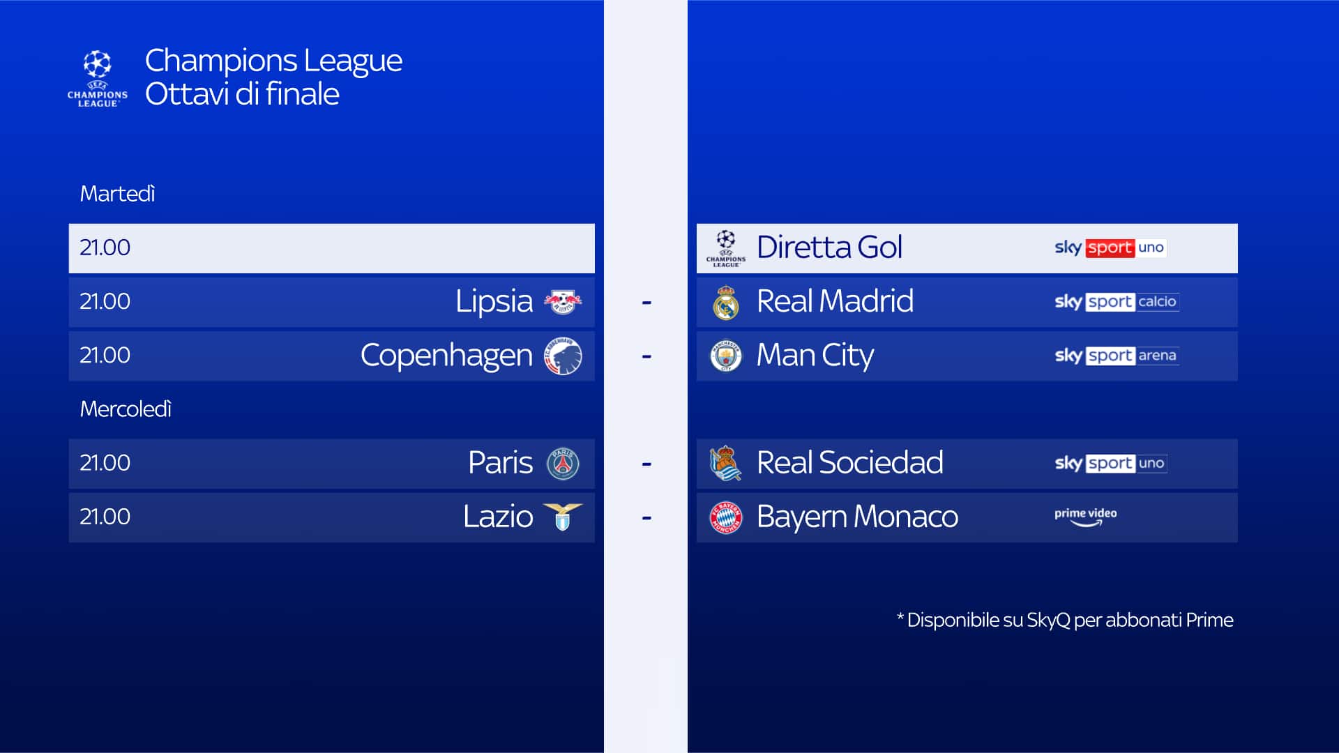 guida tvTorna la Champions League con la prima settimana degli Ottavi di Finale. Lipsia-Real Madrid è la partita da seguire stasera in diretta alle 21 su Sky, canali Sky Sport Calcio, Sky Sport 252, Sky Sport 4K e in streaming su NOW