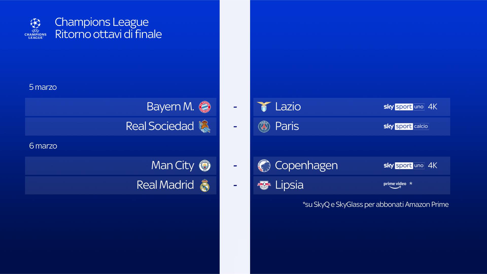 GUIDA TVRitorno degli ottavi di finale per la Champions League. Bayern Monaco-Lazio è la partita da seguire stasera in diretta alle 21 su Sky, canali Sky Sport Uno, Sky Sport 252, Sky Sport 4K e in streaming su NOW
