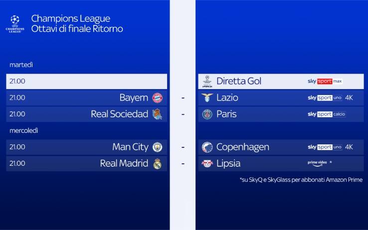 Prosegue la fase a eliminazione diretta della massima competizione europea, con la prima tranche del ritorno degli ottavi di finale, live su Sky Sport e in streaming su NOW. Mercoledì alle 21.00 sarà la volta della sfida tra gli inglesi del Manchester City e i danesi del Copenaghen, con i “Citizens” che partono dal 3-1 a loro favore di due settimane fa. Match live su Sky Sport Uno, Sky Sport 251, Sky Sport 4K e in streaming su NOW. Alla stessa ora in campo anche gli spagnoli del Real Madrid e i tedeschi del Lipsia, all’andata vittoria degli iberici per 1-0. L’incontro sarà visibile senza uscire da Sky Q, in modo semplice e diretto, attraverso l'App Prime Video di Amazon, per i clienti Sky con decoder Sky Q e abbonati al servizio Amazon Prime.