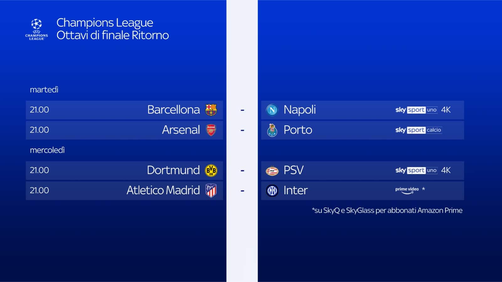 - ore 21.00: Barcellona-Napoli su Sky Sport Uno, Sky Sport 252, Sky Sport 4K e in streaming su NOW. Telecronaca di Riccardo Gentile con il commento di Lorenzo Minotti. A bordocampo Gianluca Di Marzio e Massimo Ugolini. Diretta Gol Federico Zancan.