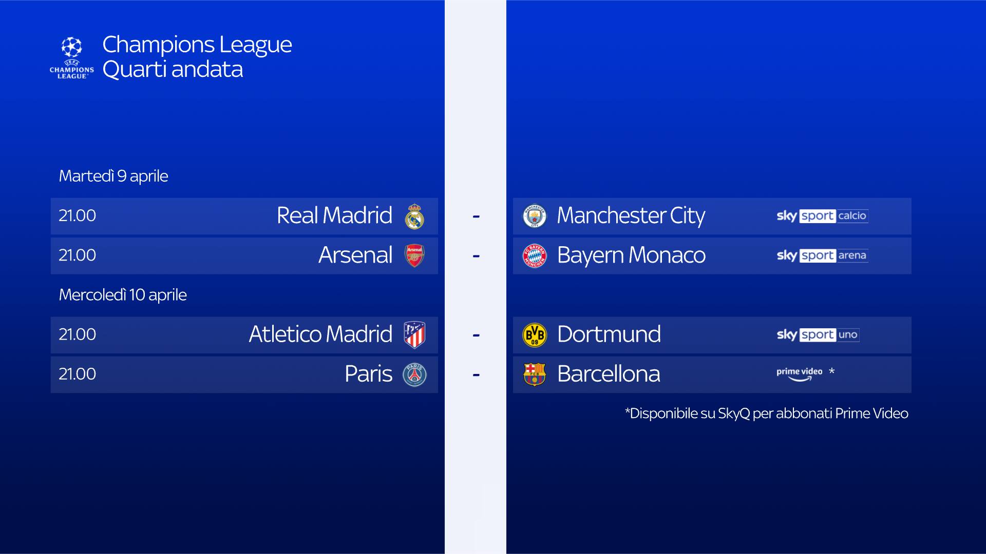Champions LeagueAndata dei Quarti di Finale per la Champions League. Real Madrid-Manchester City è la partita da seguire stasera in diretta alle 21 su Sky, canali Sky Sport Calcio, Sky Sport 252 e in streaming su NOW