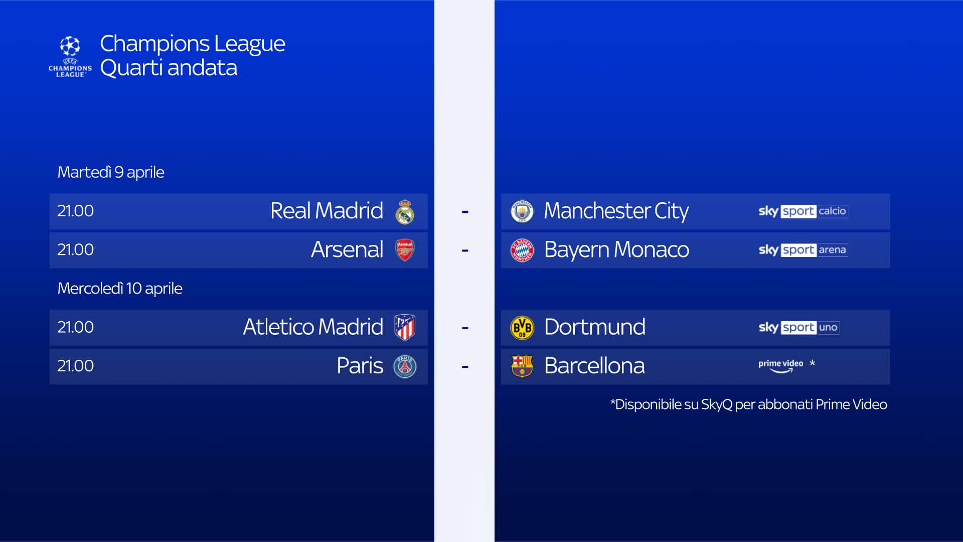 Andata dei Quarti di Finale di Champions League per Paris e Barcellona che giocano, stasera, mercoledì 10 aprile, con calcio d'inizio alle 21: il match sarà visibile senza uscire da Sky Q, in modo semplice e diretto, attraverso l'App Prime Video di Amazon, per i clienti Sky con decoder Sky Q e abbonati al servizio Amazon Prime