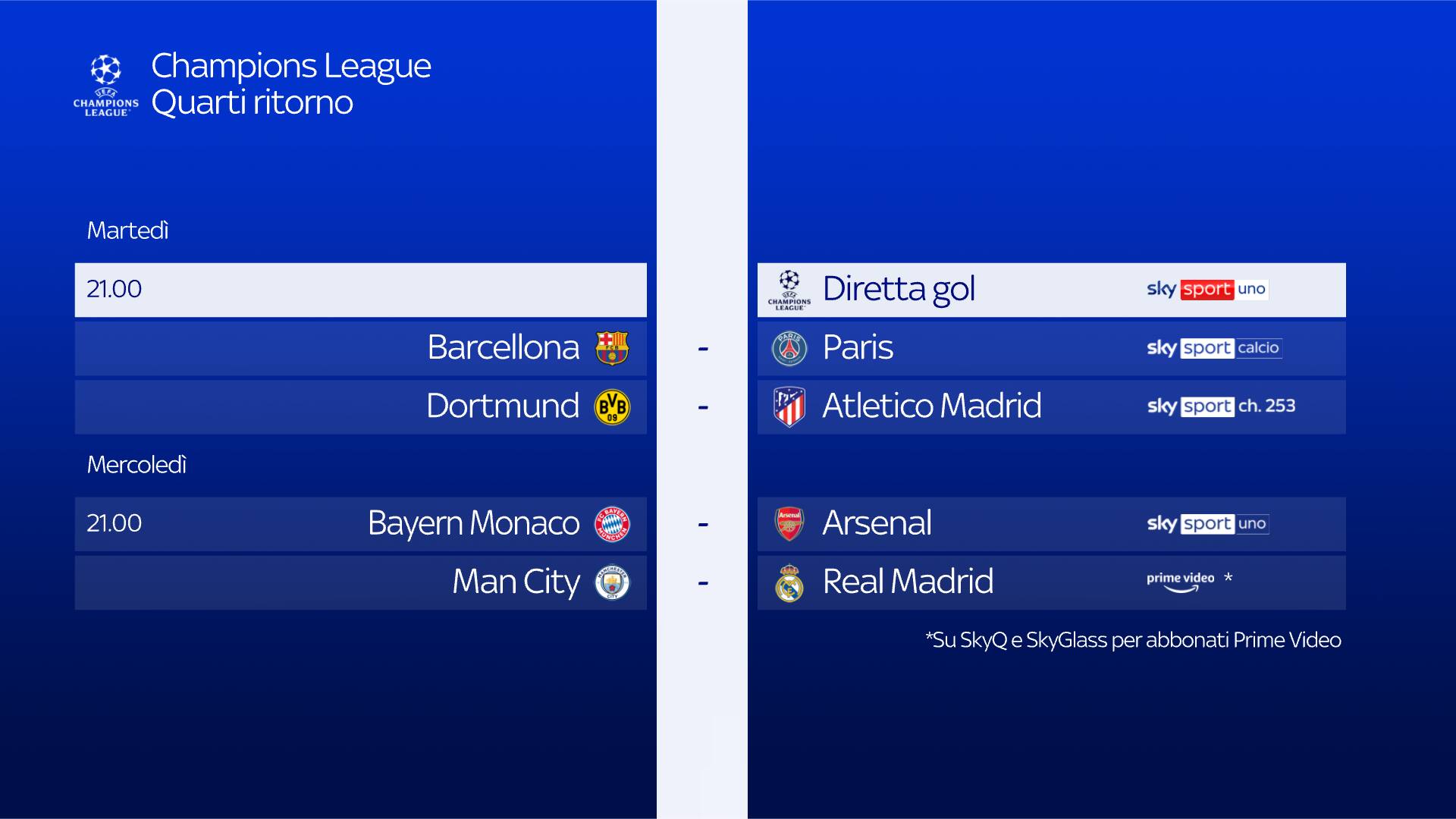 guida tvRitorno dei Quarti di Finale di Champions League per Manchester City e Real Madrid, mercoledì 17 aprile, con calcio d'inizio alle 21: il match sarà visibile senza uscire da Sky Q, in modo semplice e diretto, attraverso l'App Prime Video di Amazon, per i clienti Sky con decoder Sky Q e abbonati al servizio Amazon Prime