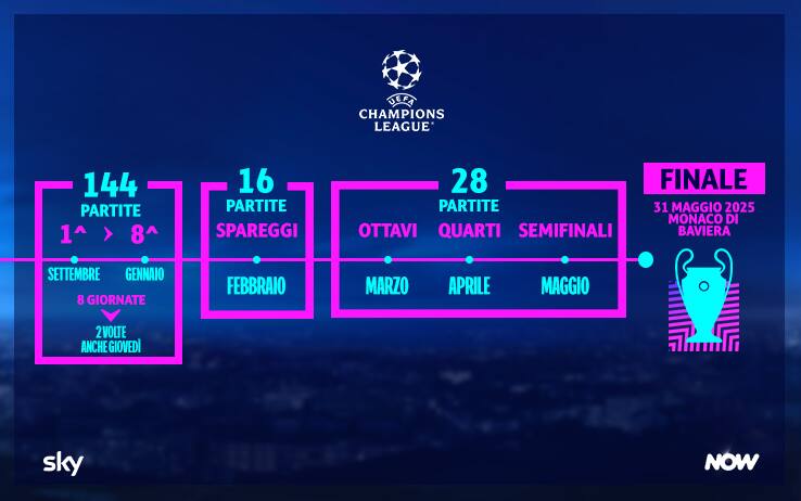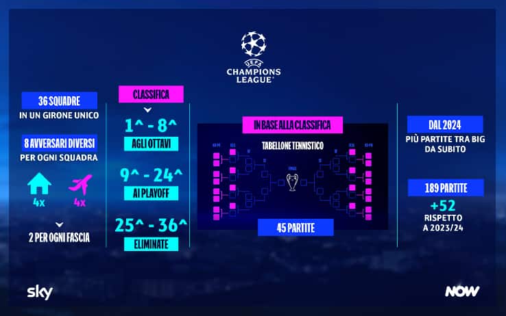 Dalla stagione 2024/2025, con l’introduzione del nuovo format Uefa, si giocherà 11 mesi su 12, con il numero delle squadre partecipanti alla fase finale che passa da 32 a 36, tutte in un girone unico. In totale Sky trasmetterà per il prossimo triennio, in esclusiva dagli stadi più belli d’Europa, ben 527 i match per ognuna delle tre stagioni di Champions League (185 partite su 203, compresi i Playoff), Europa League (189 partite) e Conference League (153 partite), anche grazie a Diretta Gol, comprese le tre finali, oltre alla Uefa Super Cup e alla Uefa Europa Super Cup, il cui nuovo formato è ancora in via di definizione. Il prologo della nuova UEFA Champions League sarà la Supercoppa UEFA, che tornerà su Sky il 14 agosto con la sfida tra l’Atalanta trionfatrice in UEFA Europa League e la vincente della finale del 1° giugno tra Borussia Dortmund e Real Madrid.