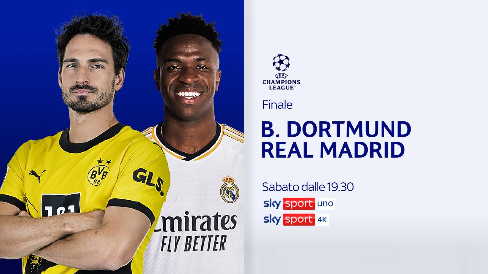 Ultimo atto della stagione per la Champions League. Sabato 1^ giugno, in campo Borussia Dortmund-Real Madrid per la finale della massima competizione europea, tutta da vivere su Sky e in streaming su NOW. Live dal leggendario stadio di Wembley, a Londra, i tedeschi e spagnoli reduci da una grandissima cavalcata europea dove hanno eliminato squadre più quotate come Atletico Madrid e PSG, andranno a caccia del titolo continentale più ambito contro i Blancos di Ancelotti, i quali vorrebbero portare a Madrid la quindicesima Champions League della loro storia. Telecronaca affidata a Federico Zancan e Luca Marchegiani, con Giorgia Cenni e Gianluca Di Marzio a bordocampo pronti a catturare dall’inizio alla fine le sensazioni e le direttive delle panchine.