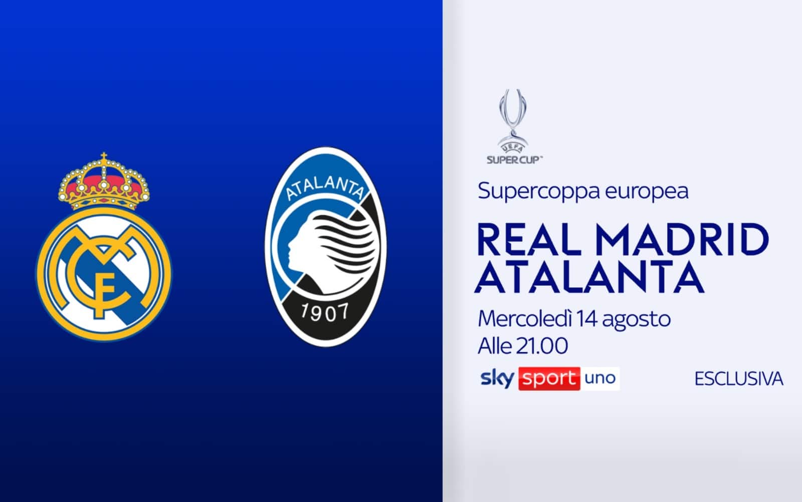 Appuntamento mercoledì 14 agosto al PGE Narodowy di Varsavia, dove si giocherà la Supercoppa europea. Si affrontano il Real Madrid, vincitore dell'ultima Champions League, e l'Atalanta che ha conquistato la scorsa Europea League. Diretta alle 21 in esclusiva su Sky Sport e in streaming su NOW.