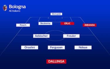 - La formazione tipo, 4-2-3-1: Skorupski; Posch, Beukema; ERLIC, MIRANDA; Aebischer, Freuler; Orsolini, Ferguson, Ndoye; DALLINGA. All. Italiano
