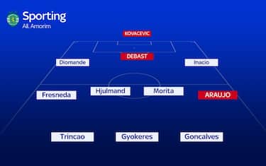 - La formazione tipo, 3-4-3: KOVACEVIC; Diomande, DEBAST, Inacio; Fresneda, Hjulmand, Morita, ARAUJO; Trincao, Gyokeres, Goncalves. All. Amorim