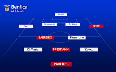 La formazione tipo, 4-2-3-1: Trubin; Bah, Otamendi, A. Silva, BESTE; BARREIRO, Florentino; Di Maria, PRESTIANNI, Kokcu; PAVLIDIS. All. Schmidt