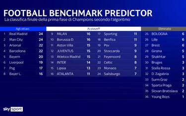 Football Benchmark ha creato un algoritmo che prende in considerazione il valore delle rose e i risultati in Champions delle ultime 6 stagioni per immaginare come potrebbe essere la classifica finale della prima fase campionato di questa nuova Champions League