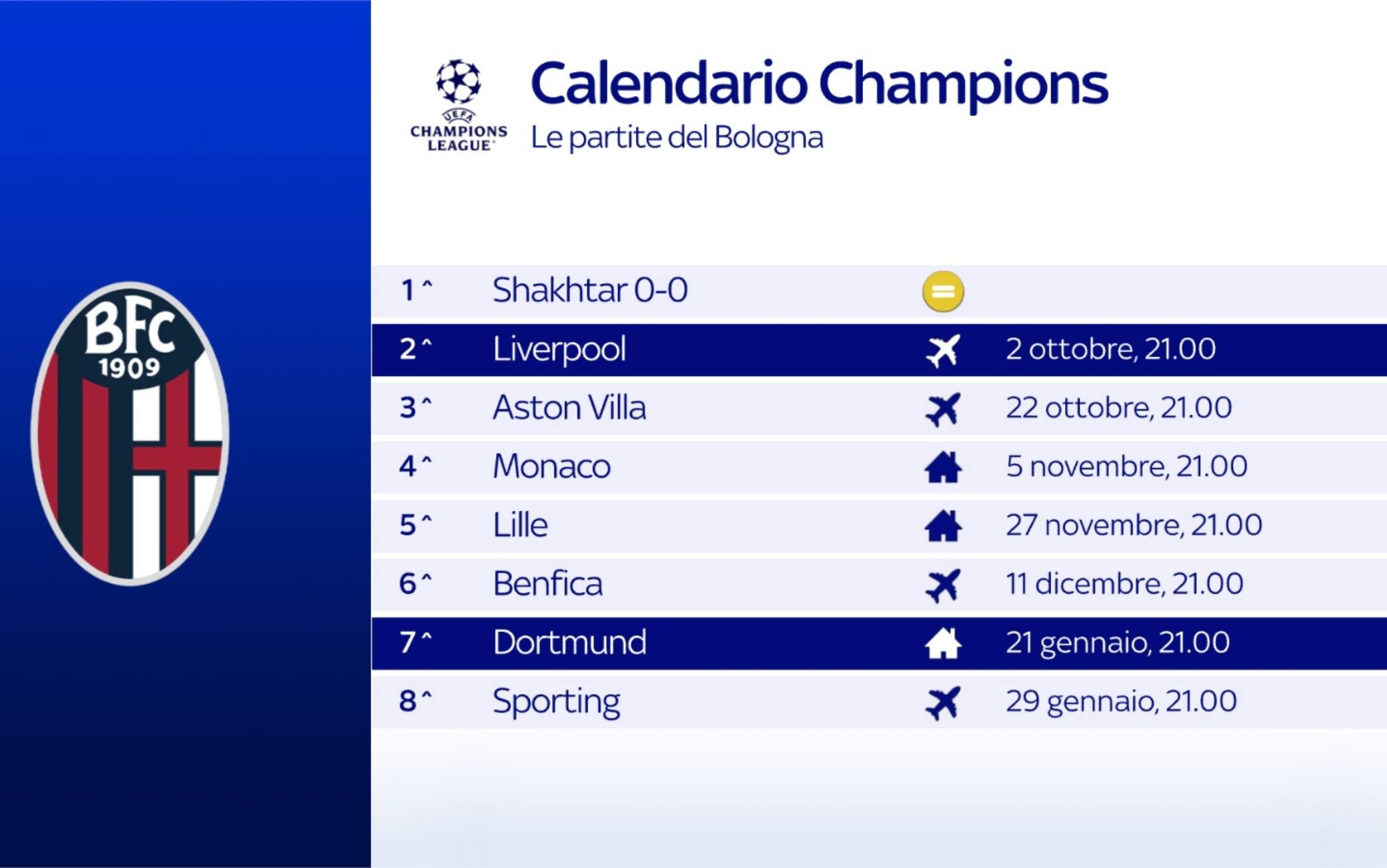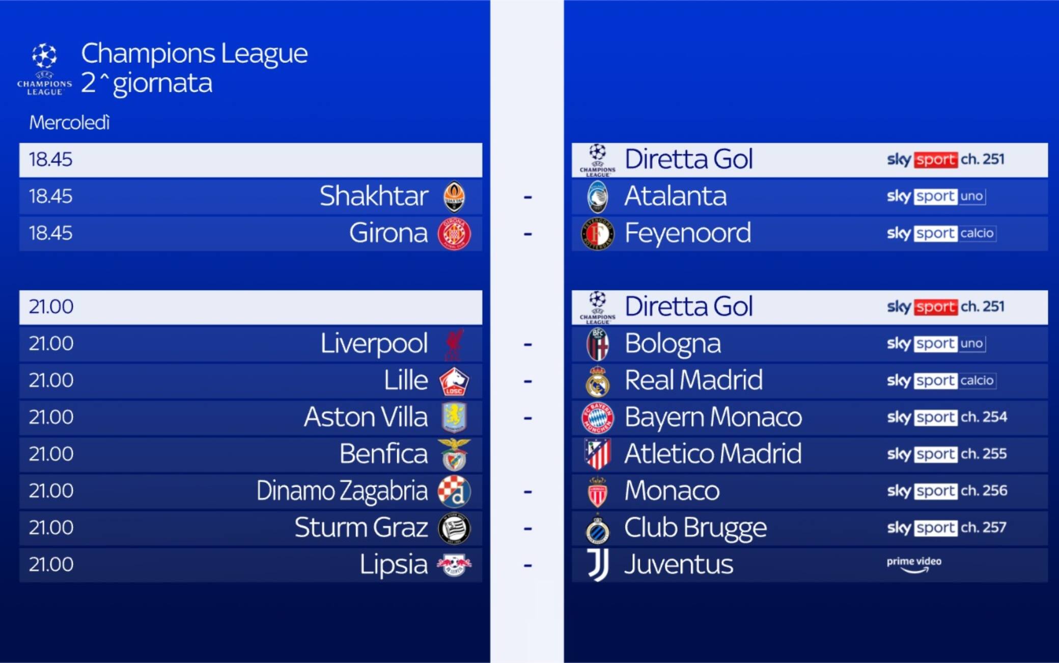 guida tvSeconda giornata di Champions League, oggi alle 21.00 il Bologna di Italiano è impegnato in Inghilterra per affrontare il Liverpool di Slot. Diretta su Sky Sport Uno, Sky Sport 252 e in streaming su NOW. Ampio spazio all’approfondimento pre e post partita con Champions League Show. Nello studio pre partita ospite Cesare Cremonini