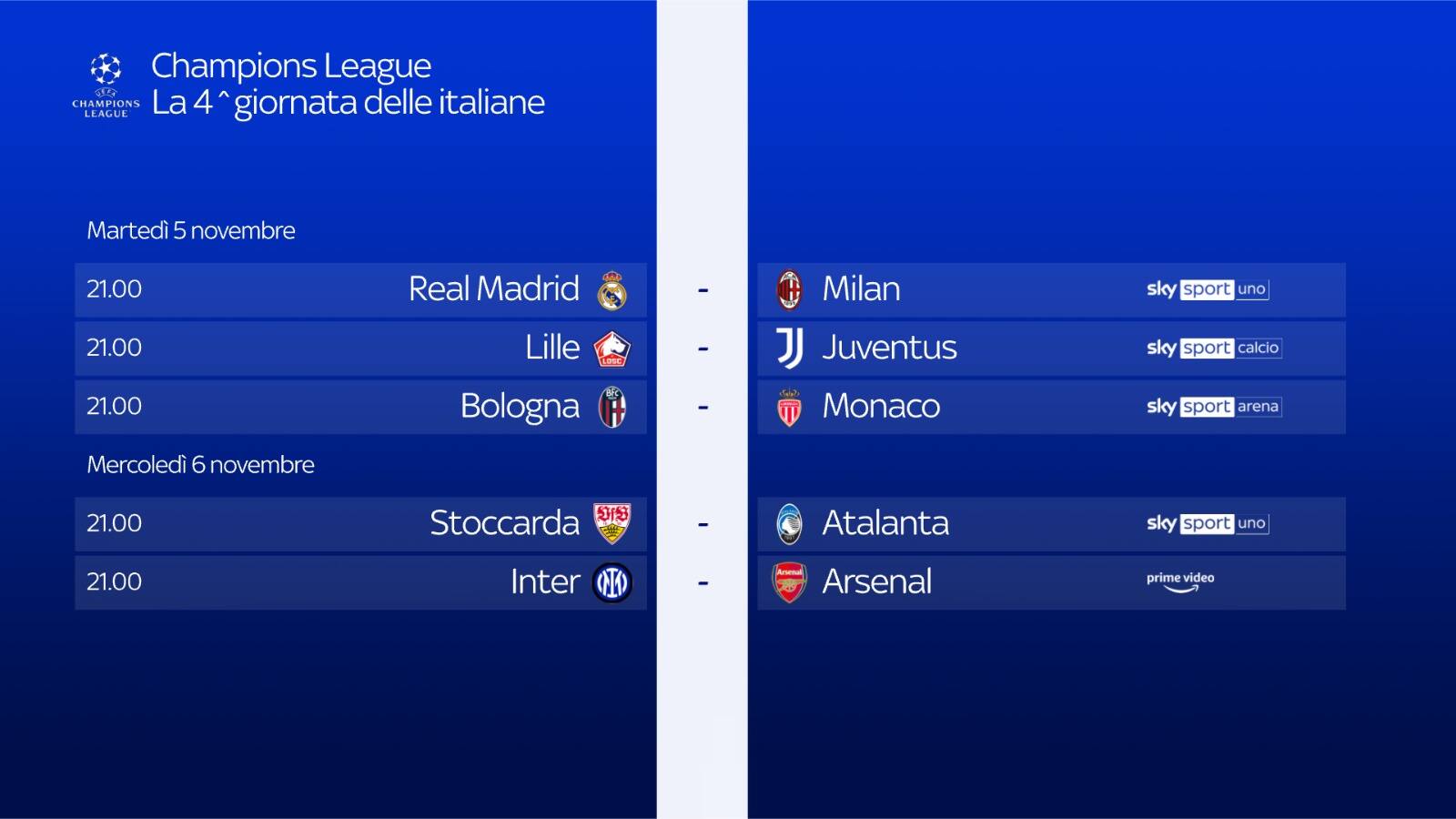Si torna in campo in Europa con la Champions League. Martedì 5 e mercoledì 6 novembre, la quarta giornata della massima competizione europea per club sarà live su Sky Sport e in streaming su NOW, con la possibilità di seguire 17 partite del primo turno, anche in contemporanea grazie a Diretta Gol. Domani alle 21 tre italiane in campo: al Santiago Bernabeu va in scena Real Madrid-Milan, in diretta su Sky Sport Uno, Sky Sport 252 e in streaming su NOW. Appuntamento francese per la Juventus, impegnata contro il Lille, in diretta su Sky Sport Arena, Sky Sport 253 e in streaming su NOW, mentre il Bologna affronterà in casa il Monaco, in diretta su Sky Sport 254, Sky Sport 4K e in streaming su NOW. Mercoledì, alle 21, sarà la volta dell’Atalanta, impegnata in Germania contro lo Stoccarda, su Sky Sport Uno, Sky Sport 252 e in streaming su NOW. Alle 21 anche Inter-Arsenal: i clienti Sky abbonati al servizio Amazon Prime potranno vedere il match in modo semplice e diretto attraverso l'app Prime Video disponibile su Sky Q, Sky Stream e Sky Glass.