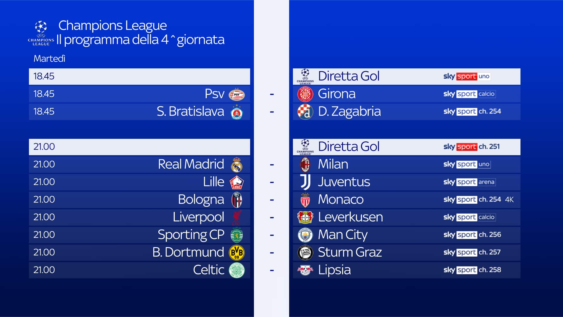 guida tvQuarta giornata di Champions League: alle 21 al Santiago Bernabeu va in scena Real Madrid-Milan, in diretta su Sky Sport Uno, Sky Sport 252 e in streaming su NOW. Ampio spazio all’approfondimento pre e post partita con Champions League Show