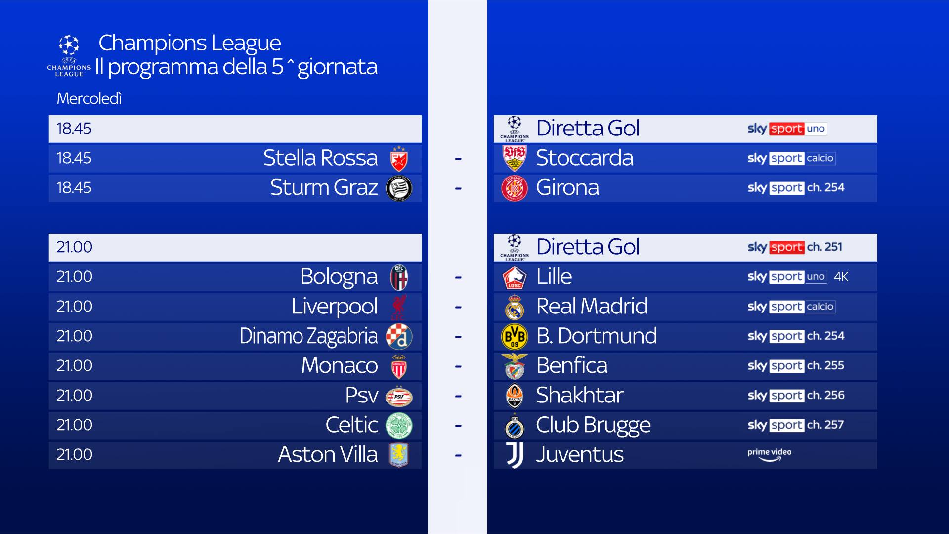 guida tvQuinta giornata di Champions League. Oggi alle 21 la Juventus scende in campo contro l'Aston Villa: i clienti Sky abbonati al servizio Amazon Prime potranno vedere il match in modo semplice e diretto attraverso l'app Prime Video disponibile su Sky Q, Sky Stream e Sky Glass. Su Sky Sport ampio spazio all'approfondimento pre e postpartita con Champions League Show, in studio Federica Masolin, Alessandro Del Piero e gli altri ospiti