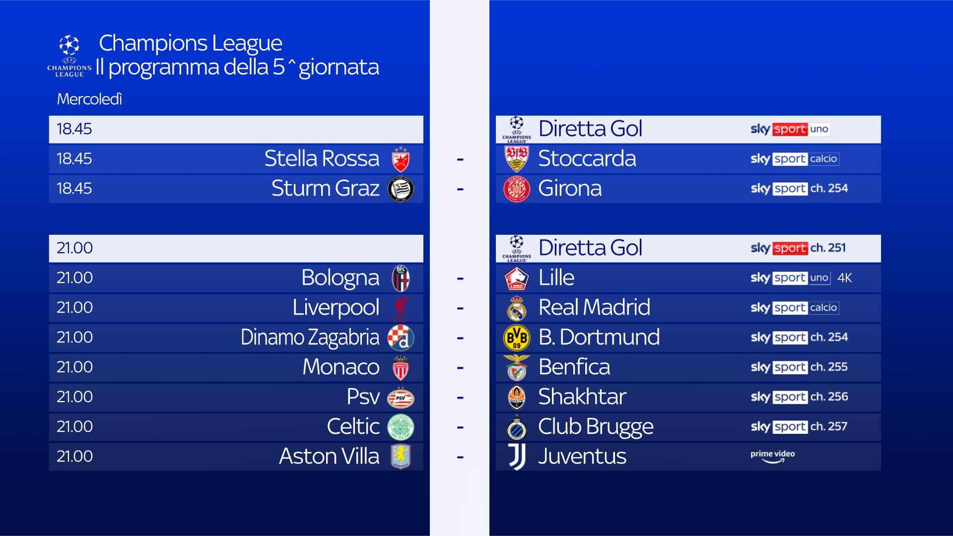 guida tvQuinta giornata di Champions League: alle 21 il Bologna ospita il Lille, da seguire in diretta su Sky Sport Uno, Sky Sport 252, Sky Sport 4K e in streaming su NOW. Ampio spazio all’approfondimento pre e post partita con Champions League Show, in studio Federica Masolin, Alessandro Del Piero e gli altri ospiti