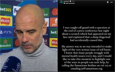 Dopo aver spiegato in diretta tv cosa avevano causato quei graffi al volto, Guardiola è tornato sull'argomento con una storia su Instagram. Il tema dell'autolesionismo è questione assai delicata e Pep scrive: "La mia risposta non intendeva in alcun modo sminuire il gravissimo problema dell’autolesionismo"