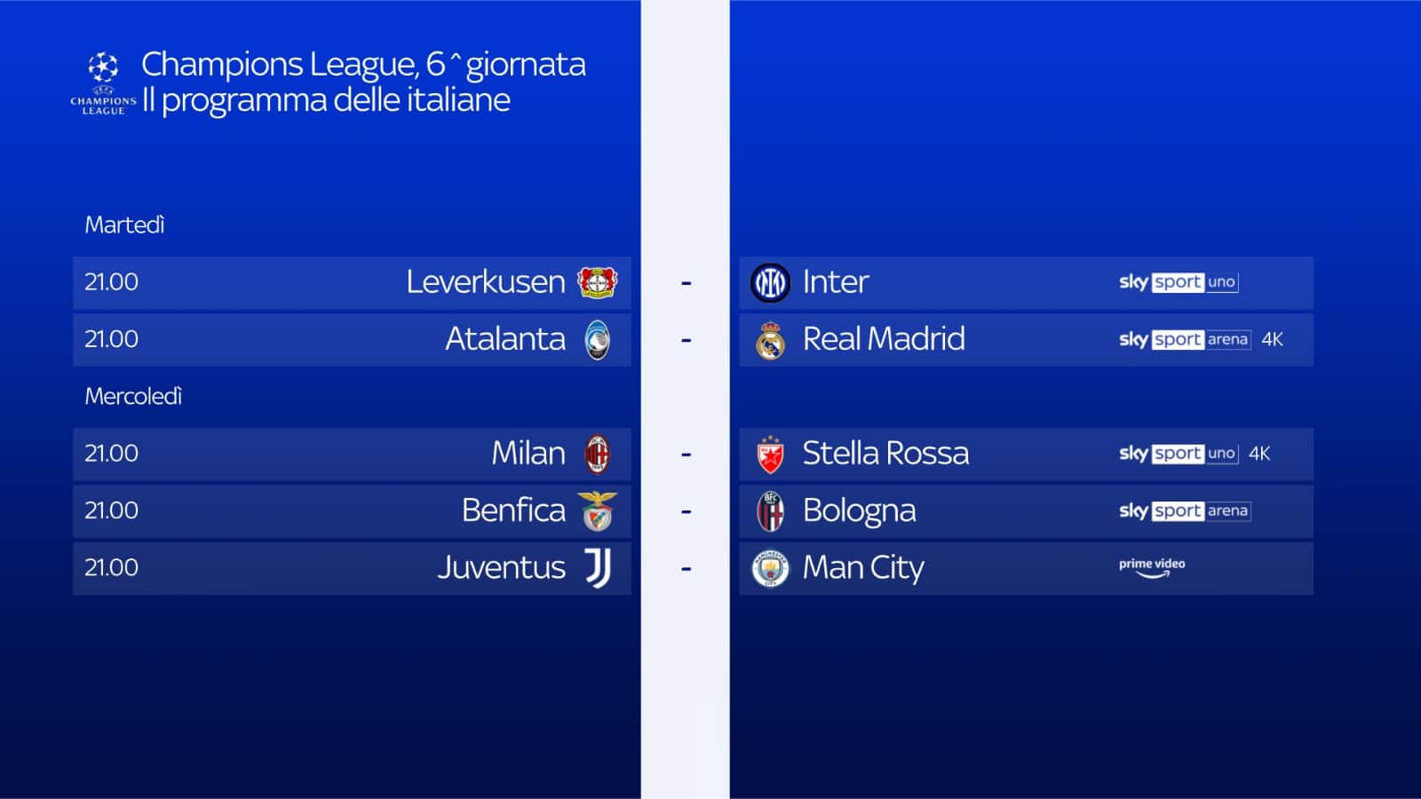 Si torna in campo in Europa con la Champions League. Martedì 10 e mercoledì 11 dicembre, la sesta giornata della massima competizione europea per club sarà live su Sky Sport e in streaming su NOW, con la possibilità di seguire 17 partite del primo turno, anche in contemporanea grazie a Diretta Gol. Domani alle 21.00 saranno due le italiane in campo: l’Inter ospite del Bayer Leverkusen, in diretta su Sky Sport Uno, Sky Sport 252 e in streaming su NOW. Big match per l’Atalanta, avversaria del Real Madrid, in diretta su Sky Sport Arena, Sky Sport 253, Sky Sport 4K e in streaming su NOW. Mercoledì, alle 21.00, sarà la volta del Bologna, impegnato fuori casa contro il Benfica, in diretta su Sky Sport Arena, Sky Sport 253 e in streaming su NOW, e di Milan-Stella Rossa, live su Sky Sport Uno, Sky Sport 252, Sky Sport 4K e in streaming su NOW. Alle 21.00 anche Juventus-Manchester City: i clienti Sky abbonati al servizio Amazon Prime potranno vedere il match in modo semplice e diretto attraverso l'app Prime Video disponibile su Sky Q, Sky Stream e Sky Glass.