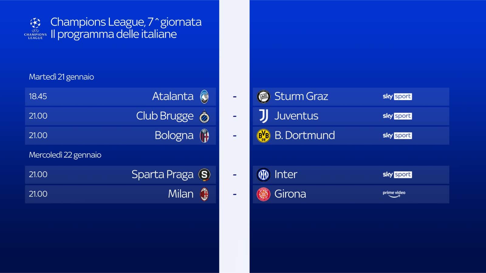 Si torna in campo in Europa con la Champions League. Martedì 21 e mercoledì 22 gennaio, la settima giornata della massima competizione europea per club sarà live su Sky Sport e in streaming su NOW, con la possibilità di seguire 17 partite del primo turno, anche in contemporanea grazie a Diretta Gol. Domani alle 18.45 Atalanta-Sturm Graz, live su Sky Sport Uno, Sky Sport 252, Sky Sport 4K e in streaming su NOW. Alle 21.00, invece, saranno ben due le italiane in campo: la Juventus ospite del Club Brugge, in diretta su Sky Sport Uno, Sky Sport 252 e in streaming su NOW, e il Bologna, avversaria del Borussia Dortmund, su Sky Sport Arena, Sky Sport 253, Sky Sport 4K e in streaming su NOW. Mercoledì, alle 21.00, sarà la volta dell’Inter, impegnata fuori casa contro lo Sparta Praga, in diretta su Sky Sport Uno, Sky Sport 252 e in streaming su NOW. Alle 21.00 anche Milan-Girona: i clienti Sky abbonati al servizio Amazon Prime potranno vedere il match in modo semplice e diretto attraverso l'app Prime Video disponibile su Sky Q, Sky Stream e Sky Glass.