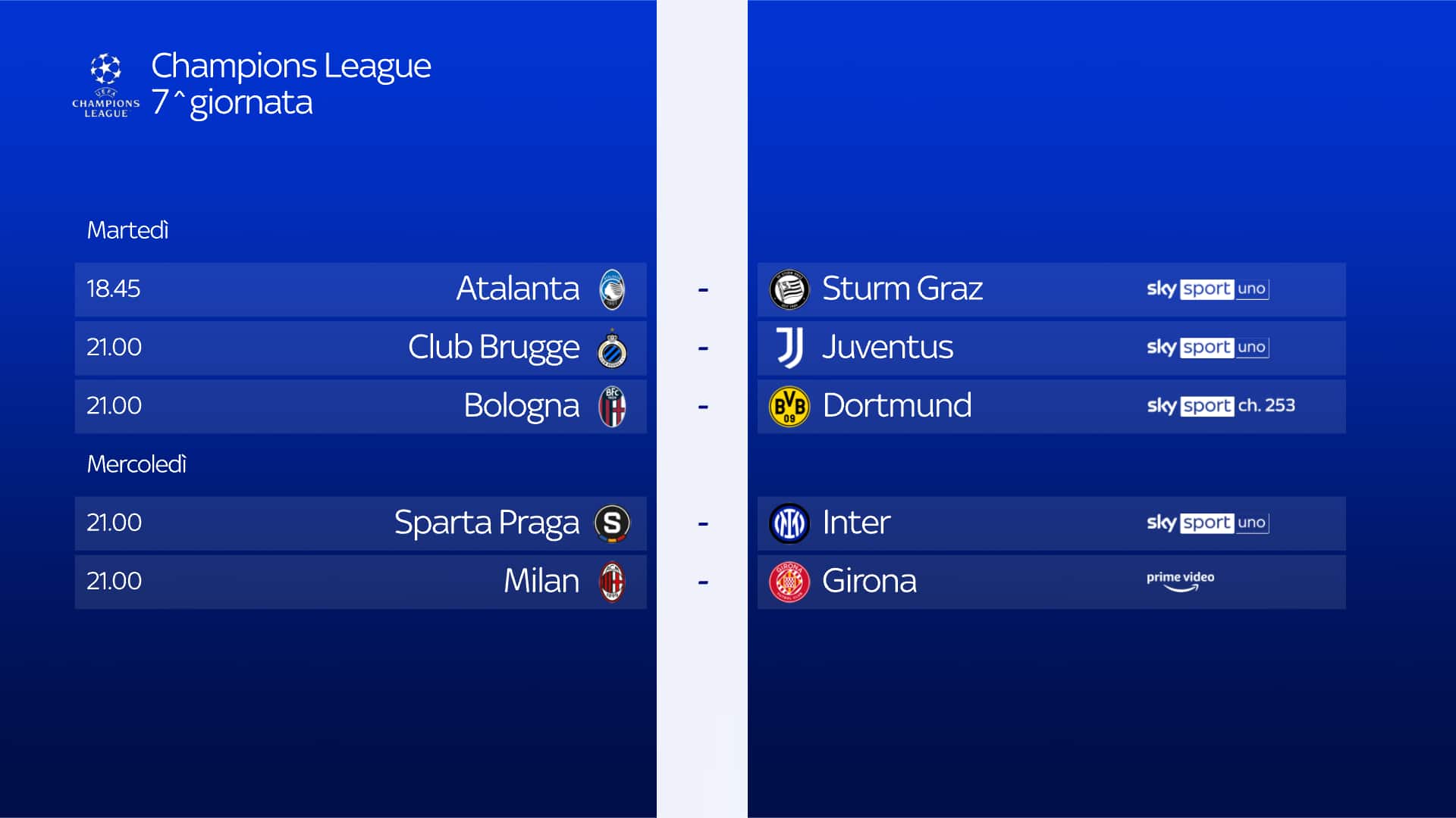 GUIDA TVsettima giornata di Champions League: alle 21 il Bologna affronta in casa il Borussia Dortmund, in diretta su Sky Sport Arena, Sky Sport 253, Sky Sport 4K e in streaming su NOW. Ampio spazio all’approfondimento pre e post partita con Champions League Show