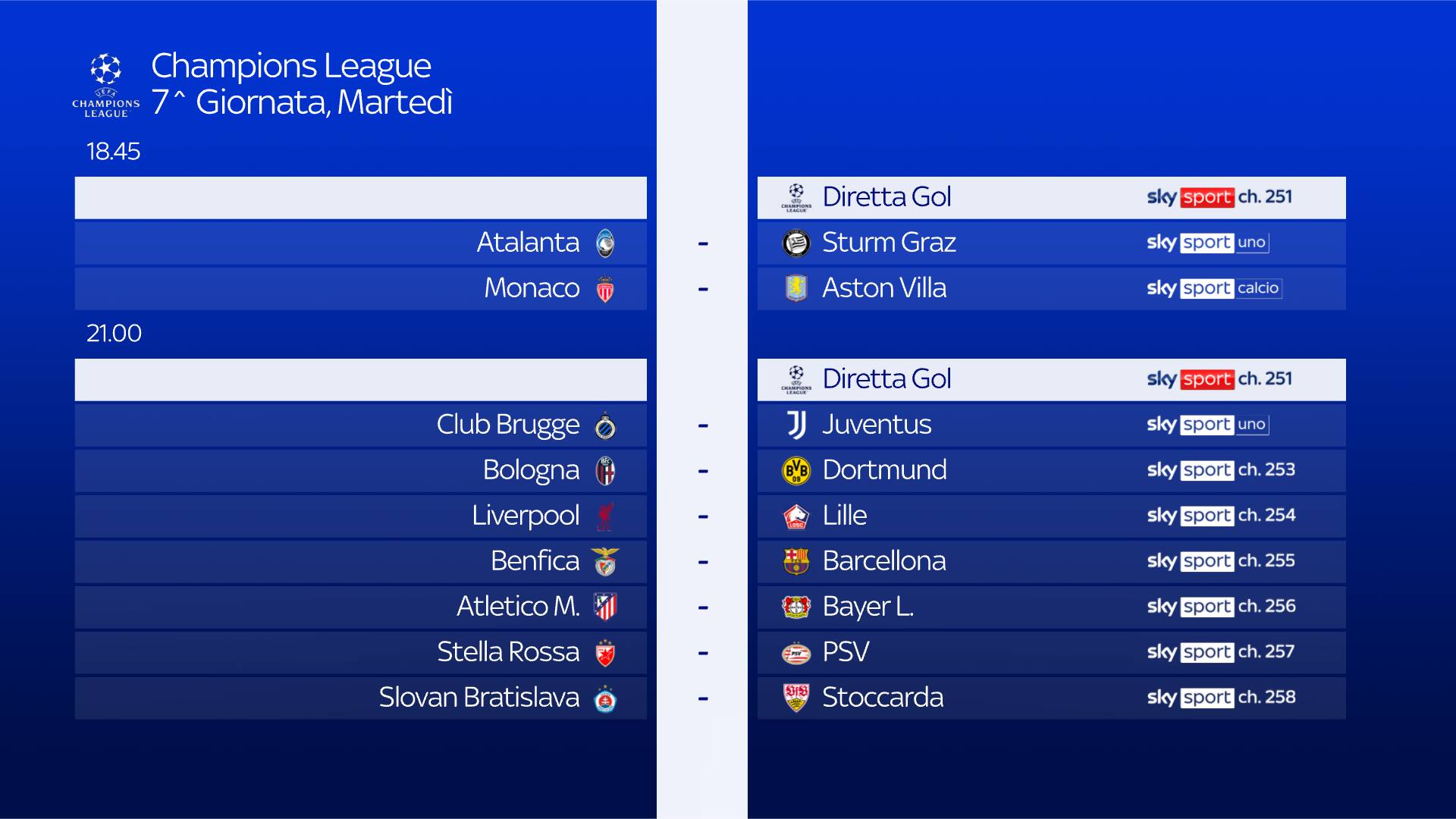guida tvSettima giornata di Champions League: alle 21 la Juve affronta in trasferta il Bruges, in diretta su Sky Sport Uno, Sky Sport 252 e in streaming su NOW. Ampio spazio all’approfondimento pre e post partita con Champions League Show