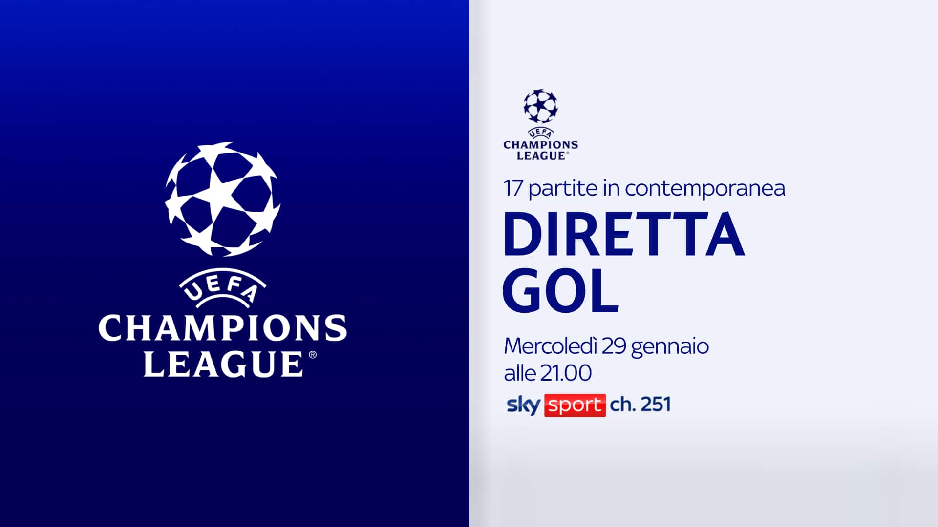 Il giro d'Europa in una notte su Sky! Ultimi 90 minuti della fase campionato della Champions League: le squadre già aritmeticamente qualificate alla prossima fase sono 18 su 24, con i risultati dell'ultima giornata fondamentali per stabilire la classifica finale che determinerà le partite dei playoff e il quadro delle qualificate agli ottavi di finale. Alle ore 21 appuntamento allora da non perdere con una Diretta Gol storica su Sky Sport 251 e NOW per seguire tutte le 17 partite in contemporanea, nella quale verranno implementate le grafiche con i risultati live e la classifica in continuo aggiornamento, con la voce fuori campo di Gianluigi Bagnulo che in tempo reale darà le ultime sulla posizione delle squadre e gli accoppiamenti dei play off. Inoltre, su Sky Sport 24 e NOW, Speciale Campo Aperto Champions League, uno studio sempre acceso in cui Mario Giunta, Alessandro Costacurta, Esteban Cambiasso, Paolo Di Canio e Luca Mastrorilli commenteranno live le partite. Infine, l’esperienza di visione dell’ultima giornata della League Phase potrà contare anche su Sky Sport Plus. Accedendo con il tasto verde del telecomando di Sky Q via satellite o il tasto interattività di Sky Glass e Sky Stream, se connessi alla rete internet, sarà possibile seguire le dirette dei 17 campi di gioco, per non perdere neanche un istante della serata che permetterà di passare da un campo all’altro per un’esperienza di visione personalizzata.