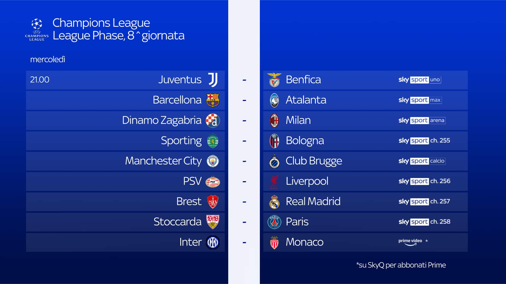 Il giro d'Europa in una notte su Sky! Ultimi 90 minuti della fase campionato della Champions League: le squadre già aritmeticamente qualificate alla prossima fase sono 18 su 24, con i risultati dell'ultima giornata fondamentali per stabilire la classifica finale che determinerà le partite dei playoff e il quadro delle qualificate agli ottavi di finale. Alle ore 21 appuntamento allora da non perdere con una Diretta Gol storica su Sky Sport 251 e NOW per seguire tutte le 17 partite in contemporanea, nella quale verranno implementate le grafiche con i risultati live e la classifica in continuo aggiornamento, con la voce fuori campo di Gianluigi Bagnulo che in tempo reale darà le ultime sulla posizione delle squadre e gli accoppiamenti dei play off. Inoltre, su Sky Sport 24 e NOW, Speciale Campo Aperto Champions League, uno studio sempre acceso in cui Mario Giunta, Alessandro Costacurta, Esteban Cambiasso, Paolo Di Canio e Luca Mastrorilli commenteranno live le partite. Infine, l’esperienza di visione dell’ultima giornata della League Phase potrà contare anche su Sky Sport Plus. Accedendo con il tasto verde del telecomando di Sky Q via satellite o il tasto interattività di Sky Glass e Sky Stream, se connessi alla rete internet, sarà possibile seguire le dirette dei 17 campi di gioco, per non perdere neanche un istante della serata che permetterà di passare da un campo all’altro per un’esperienza di visione personalizzata.